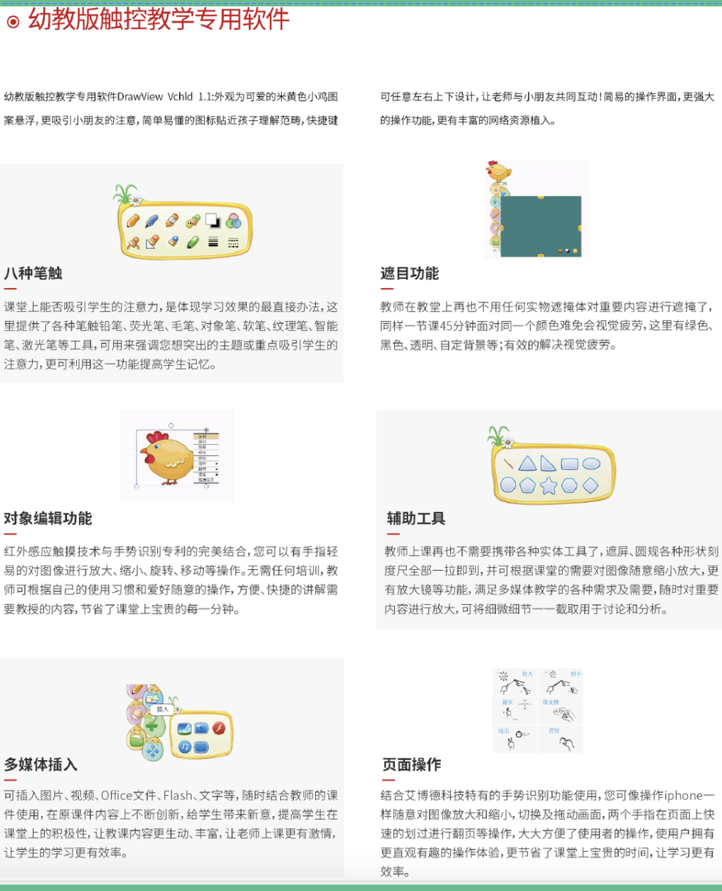 艾博德特别推出了幼教交互式电子白板,实现了从“单向灌输”到“双向互动”,寓教于乐,激发幼儿学习兴趣和求知欲,丰富幼儿的感官认识,实现互动课堂与游戏化教学。